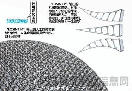 德國EOS的產品同樣使用粉末狀材料,但無需粘合劑,是使用激光進行燒結的“激光燒結方式”。也有企業(yè)稱之為“激光粉末燒結”、“粉末燒結沉積成型”。EOS的“EOSINT M”的特點是使用金屬粉末作為材料,能夠制作金屬成型品。