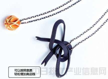 在飾品領(lǐng)域,使用3D打印機(jī)輸出成品銷售的動(dòng)向正在不斷擴(kuò)大。在福岡設(shè)有事務(wù)所的設(shè)計(jì)團(tuán)體“MONOCIRCUS”從1年前開(kāi)始銷售使用3D打印機(jī)制作的項(xiàng)鏈等飾品。價(jià)格方面,圖中黑色的飾帶為3200日元,金屬項(xiàng)鏈為3400日元。