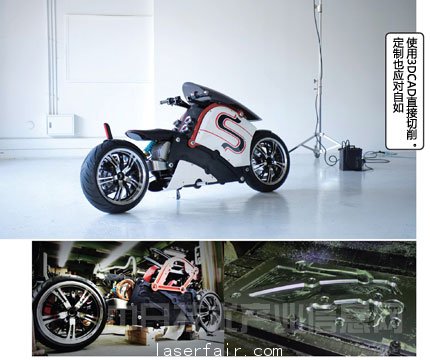 Znug Design與AUTOSTAFF的末廣合作開(kāi)發(fā)的電動(dòng)摩托車“zecOO”。從左圖可以看出,車身中央的紅色車架與黑色車架是通過(guò)切削加工制成。主要部件使用3DCAD建模,直接切削出形狀