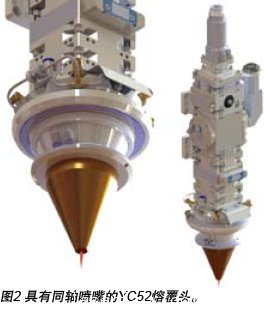 激光熔覆是一種可以用來(lái)增加金屬組件的耐磨損、耐腐蝕、抗沖擊性能的堆焊方法。這一方法利用精確聚焦大功率的激光束來(lái)形成焊接熔池并將金屬粉末加入到其中。粉末經(jīng)過(guò)一連串的惰性保護(hù)氣體通過(guò)激光束同軸送入。激光束的準(zhǔn)確性使得可以得到稀釋度極低的致密熔覆層(<5%),同時(shí)熔覆層與基體之間具有完美的冶金結(jié)合。涂層可以應(yīng)用于許多地方,并可以根據(jù)不同情況來(lái)設(shè)計(jì)其組成以克服每個(gè)組件相應(yīng)的失效機(jī)制。圖2展示了激光熔覆頭。與激光熔覆相關(guān)的主要好處之一就是能夠很好地控制熱量輸入,從而實(shí)現(xiàn)兩相沉積的金屬基復(fù)合(MMC)結(jié)構(gòu):