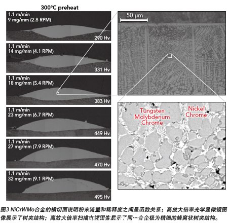 激光熔覆有許多相關(guān)的技術(shù)參數(shù),其中特別關(guān)鍵的一個(gè)是粉體質(zhì)量流量。對(duì)于一種特定的應(yīng)用來(lái)說(shuō),一旦確定了最佳的激光光斑直徑、熔覆速度和激光功率,便可利用粉體質(zhì)量流量來(lái)控制熔覆層的厚度、硬度和稀釋度,如圖3所示,我們可以看到,粉體質(zhì)量流量的增高可以有效地控制稀釋度。