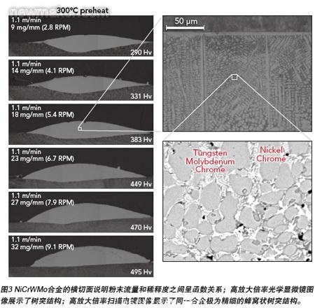 激光熔覆有許多相關(guān)的技術(shù)參數(shù),其中特別關(guān)鍵的一個是粉體質(zhì)量流量。對于一種特定的應(yīng)用來說,一旦確定了最佳的激光光斑直徑、熔覆速度和激光功率,便可利用粉體質(zhì)量流量來控制熔覆層的厚度、硬度和稀釋度,如圖3所示,我們可以看到,粉體質(zhì)量流量的增高可以有效地控制稀釋度。