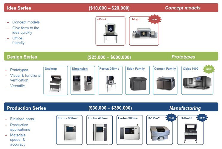 在收購(gòu)MakerBot以前,Stratasys的產(chǎn)品可分為三大序列:(1)Idea系列,主要用于概念模型,其單價(jià)為10,000~20,000美元,型號(hào)包括uPrint和Mojo;(2)Design系列,主要用于原型制造,其單價(jià)為25,000~60,000美元,型號(hào)包括Desktop、Dimension、Fortus250mc、EdenFamily、ConnexFamily、Objet1000等;(3)Production系列,主要用于制造過(guò)程,其單價(jià)為30,000~380,000美元,型號(hào)包括Fortus360mc、Fortus400mc、Fortus900mc、3ZPro、Ortho30等。