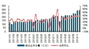 2013年,郵政企業(yè)和全國(guó)規(guī)模以上快遞服務(wù)企業(yè)業(yè)務(wù)收入(不包括郵政儲(chǔ)蓄銀行直接營(yíng)業(yè)收入)累計(jì)完成2547.8億元,同比增長(zhǎng)28.6%;業(yè)務(wù)總量累計(jì)完成2725.1億元,同比增長(zhǎng)33.8%。