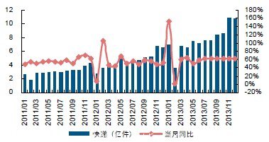 2013年,全國(guó)規(guī)模以上快遞服務(wù)企業(yè)業(yè)務(wù)量累計(jì)完成91.9億件,同比增長(zhǎng)61.6%;業(yè)務(wù)收入累計(jì)完成1441.7億元,同比增長(zhǎng)36.6%。其中,同城業(yè)務(wù)收入累計(jì)完成166.4億元,同比增長(zhǎng)51%;異地業(yè)務(wù)收入累計(jì)完成829億元,同比增長(zhǎng)30.5%;國(guó)際及港澳臺(tái)業(yè)務(wù)收入累計(jì)完成270.7億元,同比增長(zhǎng)31.7%。
