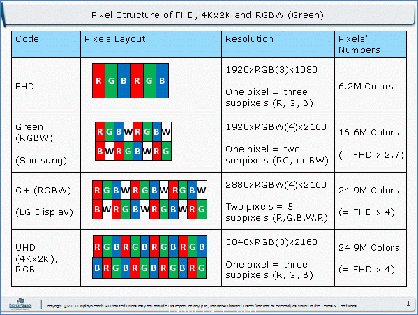 在三星的RGBW面板中,每種像素僅由兩種子像素構成(RG或BW)。這種技術最大的弊端是它的分辨率可能只有1920×RGBW×2160,畫質(zhì)也不如RGB直列式的4K面板。但是,三星電子表示其RGBW面板符合VESA對4K的定義,因為VESA定義的4K面板是基于彩色濾光片上黑速矩陣的交替數(shù)量,而不是子像素的數(shù)量。同時,三星為了提高畫質(zhì),還在其Green UHD面板中采用了GMA(色域映像算法)和SPR(子像素渲染)技術。