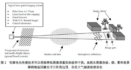 相同的時鐘可以控制檢測器的開關(guān),因此,只有物體附件范圍的后向散射被觀察到,也就是說在能力范圍內(nèi)解決目標(biāo),只要足夠照明達(dá)到目標(biāo)并返回到傳感器,范圍內(nèi)輸出干預(yù)散射。在目標(biāo)前/后消除散射和混亂是有源電光傳感的一項重要功能(如圖2 所示)。
