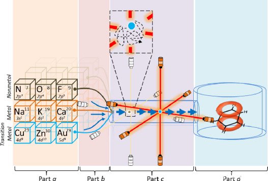藥物打印機(jī)分成4個(gè)部分:Part a是一個(gè)元素庫(kù),就如激光打印機(jī)的顏料盒,分成金屬、非金屬、過(guò)渡金屬三大塊,當(dāng)然最主要的是C、H、O這些藥物常見(jiàn)元素;Part b是各種元素輸送管路;Part c是藥物打印的核心模塊,抓取正確的原子放到正確的位置,并且形成化學(xué)鍵;Part d是產(chǎn)物儲(chǔ)存庫(kù)。