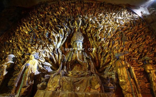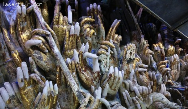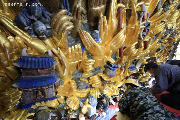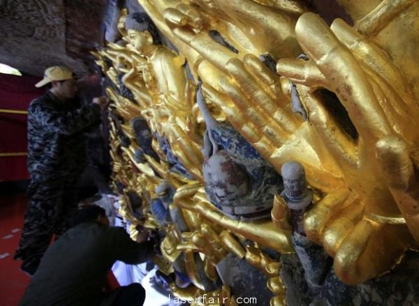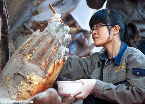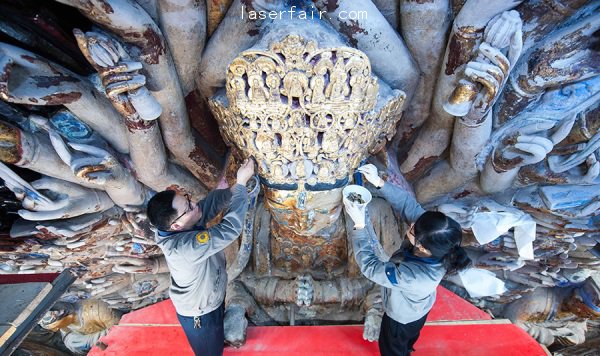 該修復(fù)工程開始于2011年4月,到現(xiàn)在為止的千手觀音的全部830只手已經(jīng)恢復(fù)。佛像的中間與上半部分,共約56平方米的面積,已清理完畢并重新上漆。