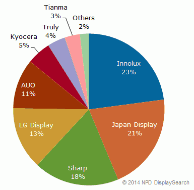 NPD DisplaySearch上海辦公室,2014年5月15日---2013年來自臺灣的群創(chuàng)光電車用顯示器出貨量超越之前的市場領導者日本顯示器及夏普,成為領先的車用TFT LCD面板供貨商。根據NPD DisplaySearch車用顯示器報告調查顯示,以出貨數量統計, 群創(chuàng)光電在2013年取得車用TFT LCD市場23%的占有率,其次是日本顯示器(21%)和夏普(18%)。