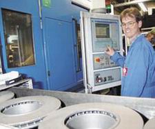 德國Lemge的PBS公司采用GG15、GG20和GG25材料生產(chǎn)剎車盤,種類多達220 種。加工剎車盤時基本上是完全乾式加工,而且通常使用陶瓷切削材料,目前該公司還在搜尋更好的切削材料。PBS公司的技術經(jīng)理Hans Konrad說,“使用陶瓷切削材料,每個切削刃平均能加工200個剎車盤,但如果我們使用CBN,我們必須使每個切削刃能至少加工 2000 個剎車盤。”換句話說,“只有當它是劃算的”,換成一種新的切削材料才是值得的。