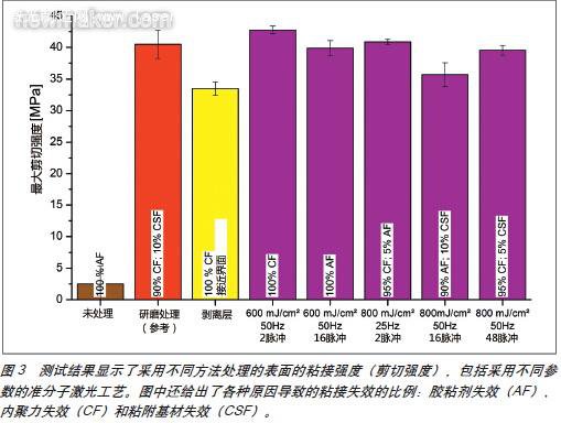 在最佳的輻照條件下(兩個(gè)600 mJ/cm2 的脈沖),材料由于內(nèi)聚力失效而分離,這意味著材料與表面的粘接強(qiáng)度比粘合劑本身更強(qiáng)。也就是說(shuō),激光已經(jīng)完全去除了所有的表面污染物,但并沒(méi)有顯著降低CFRP 材料的強(qiáng)度。