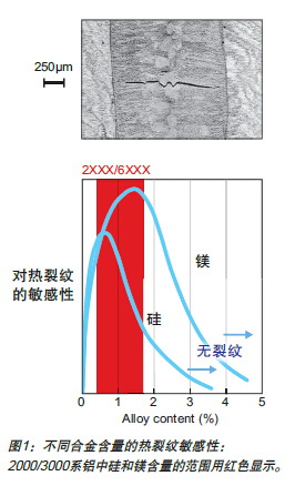 熱裂紋或者焊接凝固裂紋是凝固壓力作用于微觀結(jié)構(gòu)的結(jié)果,鋁的高熱擴(kuò)散性和導(dǎo)熱性會加劇這些裂紋。通常利用合適的填充焊絲或鑲嵌填充箔材料來改變焊接性能和避免裂紋敏感峰值就能夠避免熱裂紋敏感性(見圖1)。例如,要獲得良好可焊性,添加硅和鎂的典型值分別為大于2-3%和大于3-4%。在2000系和6000系鋁合金中這些合金的典型范圍為0.4-1.6%,意味著在大多數(shù)情況下這些合金需要填料從而實現(xiàn)無裂紋焊接。