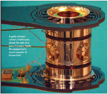 為了在地球上實(shí)現(xiàn)瞬間能夠媲美恒星和行星內(nèi)核的1億度高溫和一千億倍大氣壓的超高溫超高壓環(huán)境,NIF的大量工作始于一個9.425mm長,5.75mm直徑的金制圓柱空腔,即黑體輻射腔。在輻射腔內(nèi)是一個2mm的球體,內(nèi)含一個冰凍的氘-氚球混合冷凍的氘-氚氣體。該球體包裹在摻雜硅的塑料外殼內(nèi)。黑體輻射腔的靶——其尺寸就如同鉛筆上的橡皮那么大——放置在一個10米直徑的球形靶室內(nèi),而該靶室又位于NIF裝置的“中央車站”內(nèi),那是一個混凝土制的圍墻,其高度和直徑都是30米。