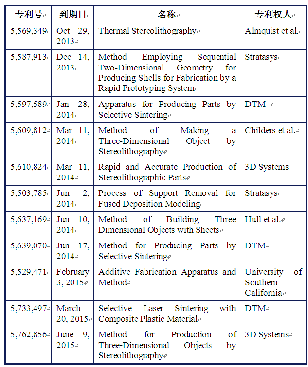 進(jìn)入2014年,對(duì)3D打印機(jī)發(fā)展有一個(gè)非常利好的消息是,F(xiàn)DM、SLA、SLS等十幾個(gè)3D打印的核心專利相繼到期,到2015也會(huì)有一些專利到期。