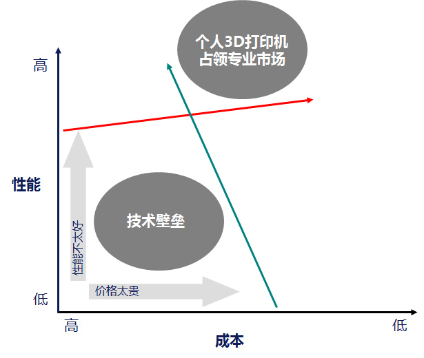 另外,從性價(jià)比上來(lái)看,專業(yè)的3D打印機(jī)價(jià)格在不斷地下降,性能也有所提升,從圖1上看,個(gè)人3D打印機(jī)從以前的幾百美元到現(xiàn)在的幾千美元,雖然價(jià)格在不斷地上升,但是它的性能上升得更快,所以在成本和性能交匯區(qū)域(圖1中左上方位置)個(gè)人3D打印機(jī)將會(huì)取代專業(yè)級(jí)3D打印機(jī)。