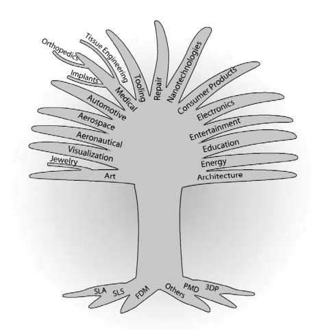 圖3的3D打印應(yīng)用樹(shù)是2009年發(fā)布的《增材制造技術(shù)路線圖》上的插圖,可以看出個(gè)人3D打印機(jī)在建筑行業(yè)、教育、醫(yī)學(xué)、珠寶等等領(lǐng)域都有非常大的應(yīng)用前景。