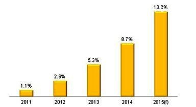 2011~2015年全球LED燈泡市場(chǎng)滲透率變化暨預(yù)測(cè)(來(lái)源:DIGITIMES,2014/12)