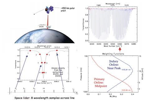 圖2 (上左) 空間測量的概念;(上右) 采用HITRAN 2004計(jì)算的兩路1570nm波長附近CO2透過率結(jié)果;(下左) 現(xiàn)在選擇的1572.33 nm CO2吸收線和波長采樣策略;(下右) 計(jì)算的權(quán)重函數(shù)