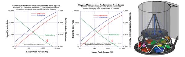 ASCENDS計(jì)劃將是第一個(gè)空間激光光譜儀器,可以為氣候和水循環(huán)監(jiān)測氣溶膠和云的變化,為開放海域生物地球化學(xué)監(jiān)測海色的變化。ASCENDS采用激光吸收光譜方法使測量全球大氣二氧化碳空間分布的精度達(dá)到1~2ppm,測量全球的陸地和海洋的二氧化碳源和匯的空間分辨率為1度,數(shù)據(jù)更新率為每月一次,可以提供對(duì)無云海洋的連續(xù)測量,在低太陽角和夜晚也能工作。