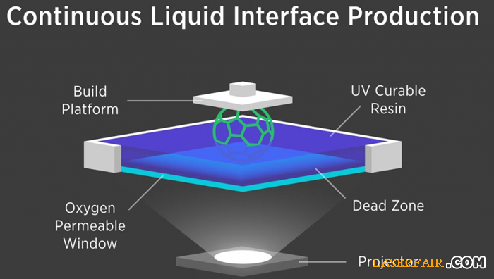 Carbon3D公司的CLIP技術(shù)的主要原理是使用氧氣抑制某一區(qū)域光敏樹脂的固化。 通過該專利技術(shù),打印對象不會出現(xiàn)通常所見的分層效果,而且打印速度極高。