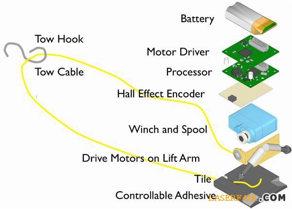 與壁虎一樣,機器人MicroTugs的底部覆蓋著數(shù)以千計微小的、毛發(fā)狀橡膠“鞋釘”,這些小“鞋釘”能夠彎曲并粘附在任何表面上,形成超強粘力。一旦被鎖定到地面上,MicroTugs就是有自帶的馬達拖著它的負載(通過纜線和吊鉤)向前行?;蛟S您會問了,粘得那么結(jié)實機器人怎么邁腿???其實,只要一個指令,這些彎曲的“鞋釘”就可變直,機器人相應的腳就可以輕松離開地面了。