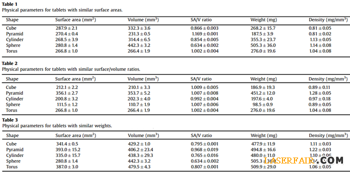 “片劑的藥物釋放動力學(xué)顯示其對于表面積并不存在依賴關(guān)系,而是跟表面積與體積的比率直接相關(guān),這表明了幾何形狀對藥物釋放曲線的影響。而大量形狀類似的片劑表現(xiàn)出來的溶解曲線幾乎沒有差別。“