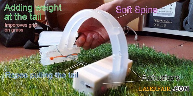 “好吧,它并非全部都是軟的,但它有一些軟的部分,比如熱膠棒。”Mihaylov表示。“這些熱膠棒在整個設(shè)計中起到了核心的作用,它們構(gòu)成了軟機(jī)器人的主體,而且由于有一定的彈性,它還起到了彈簧的作用,以此驅(qū)動機(jī)器人向前移動。”
