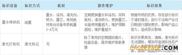 對于產(chǎn)品的追溯可以有效的管控從生產(chǎn)到出貨到銷售再到消費者各個環(huán)節(jié),大幅提高公司管控的能力,減少了運(yùn)營成本。對比發(fā)現(xiàn),在產(chǎn)品品質(zhì)提高的前提下,采用激光標(biāo)識系統(tǒng)從長期來看,減少設(shè)備維護(hù)、人工成本、耗材成本,而且減少了停線檢修的頻次,間接增加了產(chǎn)量。