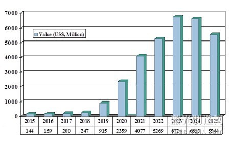 據(jù)該報告數(shù)據(jù)顯示,2015OLED照明全球銷售額將達到1.5億美元(折合人民幣約9.55億),預(yù)計將以75%的年平均增長率成長,2020年將達24億美元(折合人民幣約152.84億)。到2023年,OLED照明總產(chǎn)值預(yù)計將飆升至最高值——67億美元(折合人民幣約462.48億元)。隨后,到2025年預(yù)計將回落到55億美元。