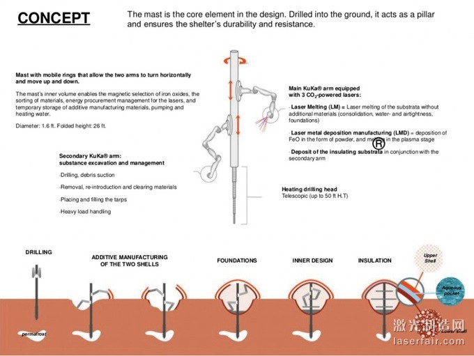 設計團隊稱,水會被存儲在Sfero外部兩層鐵至外殼之間,這樣能夠幫助屏蔽外部致命的太陽輻射。而用來打造Sfero的機器人將具有長長的柱狀外形,它將鉆入火星表面幾米深以從土壤中提取材料構建居所外殼。該機器人有兩個相互獨立的手臂,一個用于從土壤中獲取鐵材料,另外一個手臂上則安裝了金屬3D打印機,它能夠將生鐵轉化為金屬粉末然后再用高功率激光一起熔化。打印機將首先使用鐵打造堅實的地基。然后再制造Sfero的兩層外殼,每層外殼都將是球形,而且其內部是蜂窩結構,這使它的強度足以抵抗Sfero內部宜人的氣壓與火星表面氣壓的差距。
