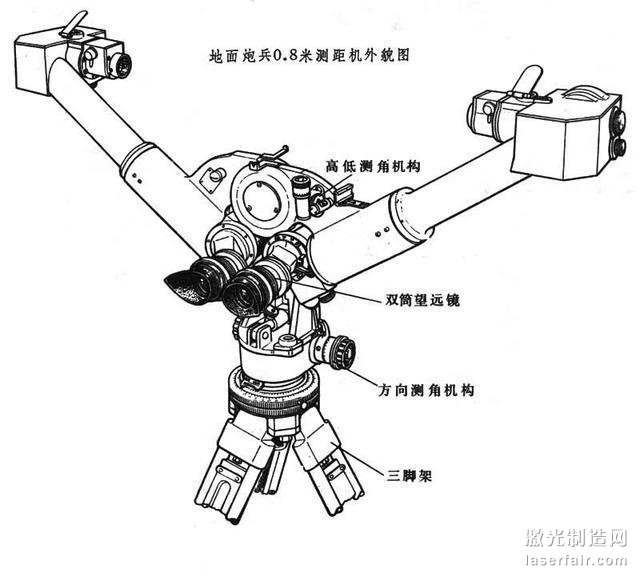 該機(jī)由測距儀、測角儀、三腳架及附件組成。工作時(shí)使用一枚12伏可充電鎳鎘電池供電。利用波長為1.06μm的激光對目標(biāo)進(jìn)行測距,該波長的激光近距離照射人體時(shí)會(huì)產(chǎn)生一定的損害作用,因此絕對不允許向我方人員發(fā)射激光束,嚴(yán)禁在激光測距機(jī)前站人,嚴(yán)禁用眼睛看激光發(fā)射窗,以免傷人或致盲。直到新世紀(jì)初期,我軍使用的大部分激光測距機(jī)都是1.06μm波長,包括99式坦克激光測距機(jī),而此時(shí)外軍已經(jīng)普遍裝備了1.5xμm人眼安全型激光測距機(jī),這種人眼安全型激光測距機(jī)在我軍直到2010年前后才有應(yīng)用。
