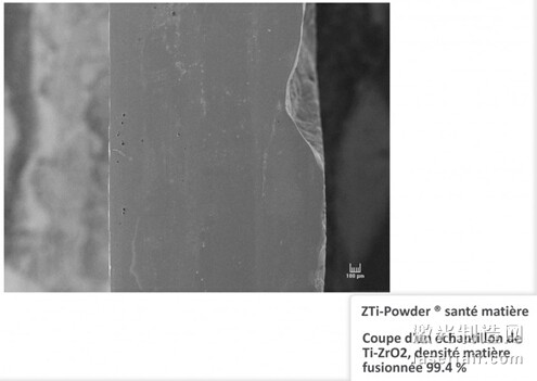 據(jù)了解,這種材料混合物的最終產(chǎn)品形態(tài)是ZTI-粉末(ZTi-Powder),這是一種可用于選擇性激光熔融(SLM)技術(shù)的鈦-陶瓷組合材料。鈦的延展性與氧化鋯的硬化性質(zhì)混合所形成的這種輕便、堅韌的金屬類粉末足以承受超過1000攝氏度的熱量。要知道,鈦和鋯這兩種元素彼此極為互補,這不僅是因為它們都包含天然的延展性,而且它們各自的弱點都恰好被對方所補充。比如鈦的強度很高,但是很不耐磨;而鋯則相反,耐磨、耐腐蝕是它的強項,而強度則是其弱點。另外,氧化鋯是一種理想的陶瓷原料。
