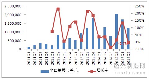 從季度出口額的增長趨勢看,2012Q12014Q2出口額一直處于高速增長,2013Q3增長率達到最高213.8%。在2014Q3開始,出口額增速開始變緩,雖然2015Q1出口額增長率回彈,達到133%,但2015Q2的出口額為120萬美元,出口增速僅為-2.7%。