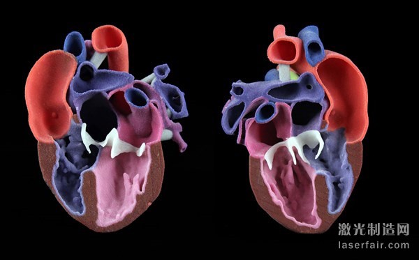 而且醫(yī)生可以根據(jù)自己的不同目的和要求選擇用來3D打印的材料和技術(shù)。使用其ColorJet Printing (CJP)技術(shù)打印的真實(shí)大小心臟模型可以全彩展示更加逼真的心臟結(jié)構(gòu),使復(fù)雜的先天性心臟缺陷更容易理解。然而,使用SLA技術(shù)3D打印的半透明脈管系統(tǒng)模型,然后再用鈣化沉積進(jìn)行選擇性著色,可以突出器官的特定區(qū)域,對(duì)于醫(yī)生們也非常有用。