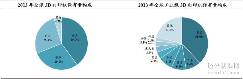 從全球3D打印機(jī)保有量的角度看,歐美國家是全球3D打印最主要的市場區(qū)域,歐美占比接近70%。歐美國家在3D打印產(chǎn)業(yè)中一直處于領(lǐng)先地位。根據(jù)Wohlers報(bào)道,2013年全球3D打印機(jī)市場中,歐美國家合計(jì)占了約70%的市場,其中,北美市占率40%,歐洲市占率29%。