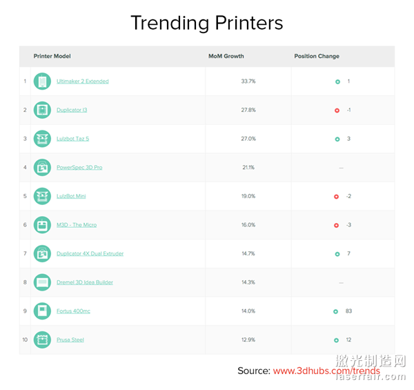 而在3D打印機(jī)的增長(zhǎng)趨勢(shì)排行榜上就變化比較大了,由于這里只比較增長(zhǎng)率,因此我們經(jīng)常能夠看到很多新面孔出現(xiàn)。Ultimaker 2本月上升一位成了增長(zhǎng)最快的3D打印機(jī)品牌。而最近剛獲《Make:》雜志評(píng)測(cè)大獎(jiǎng)的LulzBot TAZ 5不出意料,從第5位一躍升至第2。而正式上市不久的Micro 3D打印機(jī)跌出了前五名,月度增速為16%,而3D Hubs指出由于該公司在Kickstarter售出的1萬(wàn)多臺(tái)3D打印機(jī)剛剛交貨不久,因此不能指望它會(huì)增長(zhǎng)得很快。