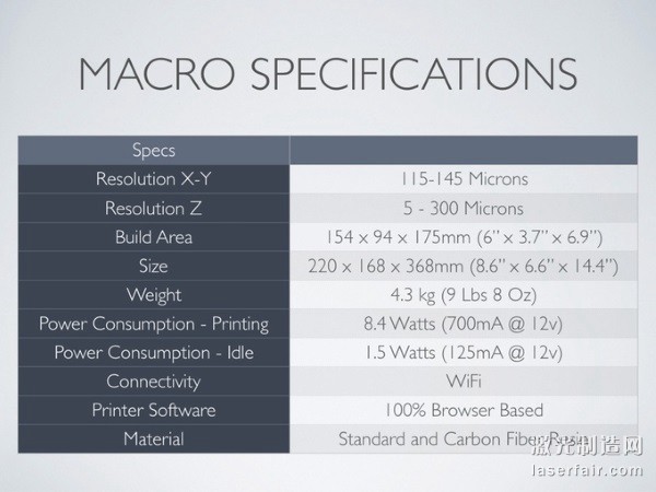 除此之外,iBox Printers還宣稱Macro是市場上最便宜的全尺寸桌面3D樹脂打印機。目前在Kickstarter上所有超級優(yōu)惠價都已被搶購一空,不過目前支持者們?nèi)匀荒軌蛞暂^為優(yōu)惠的價格999美元訂購Macro 3D打印機。該產(chǎn)品的發(fā)貨期為20164月。
