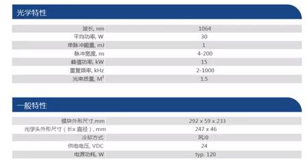 YLPN-1-4x200-30-M納秒摻鐿光纖激光器可提供脈寬范圍為4-200 ns、峰值功率最高可達(dá)15 kW;4-200 ns脈沖寬度可調(diào)。該激光器可直接外部觸發(fā),在整個2-1000 kHz重復(fù)頻率內(nèi),單脈沖能量可達(dá)1 mJ,平均功率獨(dú)立于單能量可單獨(dú)調(diào)節(jié),最高為30 W。該激光器配備光隔離器,保證高輸出功率穩(wěn)定性的同時,可以加工高反光材料。
