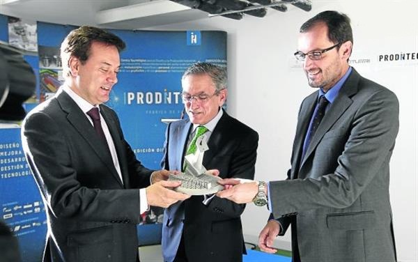 Íñigo Felgueroso(右)、Ginés Clemente和就業(yè)、工業(yè)與旅游部長(zhǎng)Francisco Blanco共同拿著一個(gè)3D打印的飛機(jī)部件