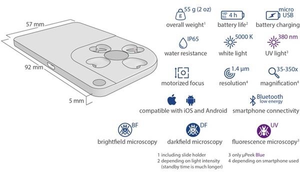 而它基本上就是該公司在Kickstarter上描述的:“μPeek是一個(gè)精巧的小工具,可以讓用戶把他們的智能手機(jī)當(dāng)作顯微鏡用。可以說,μPeek是第一款智能手機(jī)顯微鏡,它結(jié)合了顯微鏡的功能、美觀的外形,并可通過一個(gè)簡(jiǎn)單易用的Android/iOS應(yīng)用程序進(jìn)行操作。”μPeek只有一張信用卡那么大,但是上面擠滿了技術(shù),其中包括電動(dòng)鏡頭和照明光學(xué)器件。非常適合在戶外活動(dòng)或者展示中使用。此外它上面還有一種特殊的粘膠,可以完美地與您的智能手機(jī)粘接到一起,不留殘?jiān)?/span>