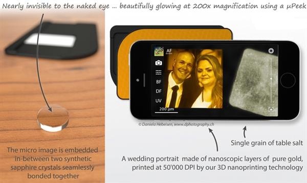 雖然這個(gè)“顯微鏡中的瑞士軍刀”肯定是相當(dāng)吸引人的。但是我們更加感興趣的是他們作為贈(zèng)品之一的3D打印微型人像(被包含在一個(gè)600美元的產(chǎn)品包中)。“這項(xiàng)技術(shù)剛從實(shí)驗(yàn)室里出來,您現(xiàn)在可以把自己的個(gè)人形象帶到微觀領(lǐng)域了。”他們解釋說。“使用最新的3D納米打?。?/span>nanoprinting)技術(shù),我們將創(chuàng)造出甚至連高檔的電腦芯片制造工藝都不能實(shí)現(xiàn)的奇跡。您的圖片會(huì)被濃縮成只有一顆鹽粒那么大,它是用純金或者熒光納米粒子制成的。您的肉眼唯一能夠看到的只是一個(gè)閃爍的小點(diǎn)。但是這時(shí)您可以用μPeek充分展示它的真身,肯定能夠給您的朋友留下深刻的印象。”