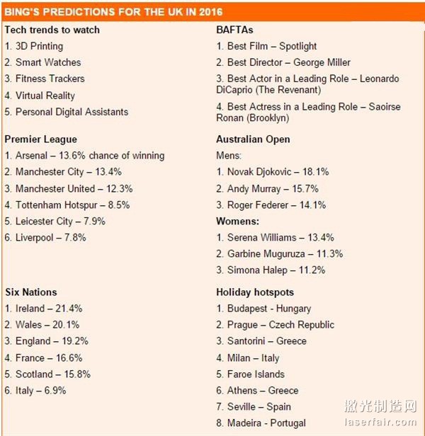 這一大膽預(yù)測只是必應(yīng)剛剛完成的一系列繁多預(yù)測中的一部分,其它還包括體育賽事結(jié)果、最受歡迎的度假勝地,甚至包括什么電影會在電影節(jié)上獲獎等等。比如該搜索引擎就預(yù)測布達(dá)佩斯將是今年最大的旅游熱點、Novak Djokovic將贏取澳網(wǎng)公開賽冠軍,而阿森納將在英超聯(lián)賽中笑到最后。