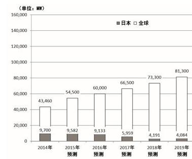 關(guān)于從接單到施工的前置時間較短的住宅市場,“因2014年秋季實施的并網(wǎng)擱置使得消費者的購買意愿降低,造成了供貨低迷”(光伏發(fā)電協(xié)會)。而非住宅市場方面,認證而尚未運轉(zhuǎn)的項目還剩余約58GW以上,因此最近幾年估計供貨會保持堅挺。多家民間調(diào)查公司預(yù)測,2016年的光伏發(fā)電市場將與2015年相同,繼續(xù)保持8~9GW的高水平。