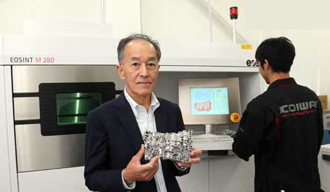 小巖井豐己社長(zhǎng)和使用金屬粉末3D打印機(jī)“EOSINT M280”制作的鋁制造型物