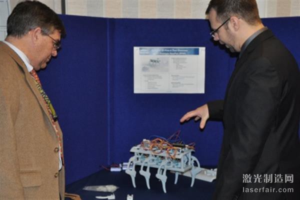 更令人印象深刻的是活動中展出的六足機(jī)器人(HexPod Robot),該機(jī)器人仍處于開發(fā)階段。它的目標(biāo)是輔助作戰(zhàn)人員,比如通過低功耗運動穿越困難地形等。這款機(jī)器人從最初的概念到變成一個完整的3D打印原型只用了四個星期(原本通常要用34個月)。有趣的是,在離活動只有12個小時的時候,工程師們還通過快速調(diào)整減輕了它的重量,因為他們覺得它太重了。