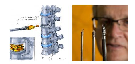在論文中,這些手術(shù)工具包括一個小到可以穿過3毫米寬的洞的工具鉗。D-Core一開始是扁平的,可以通過切口插入,而一旦進入人體內(nèi)就可以擴展成為兩個圓形的表面,模擬椎間盤彼此滾動。