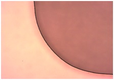 上圖為玻璃在100倍顯微鏡下的切割工藝圖,由此可見玻璃線段圓滑,無毛刺,無沾渣。