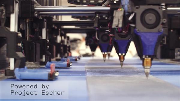 Escher項(xiàng)目的硬件負(fù)責(zé)人Cory Bloome稱:“Escher利用并行處理系統(tǒng)讓許多3D打印擠出機(jī)進(jìn)行協(xié)作,在這里尺寸將不會(huì)成為障礙。”