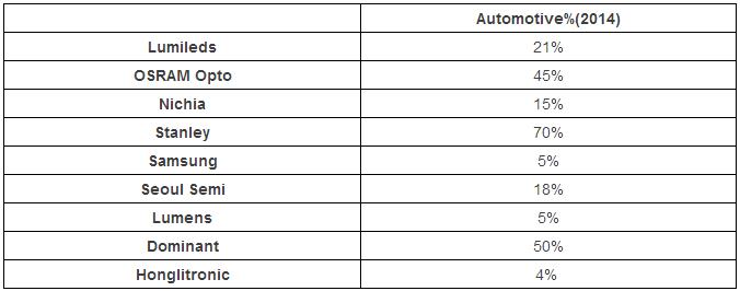 可以看到,近年來(lái)國(guó)際一線(xiàn)LED供貨商已逐漸減少在背光與照明市場(chǎng)的比重,轉(zhuǎn)而支持在車(chē)用與其他利基型應(yīng)用(見(jiàn)下表)。車(chē)用的高可靠度需求,使得一線(xiàn)品牌依然享有壟斷市場(chǎng)的優(yōu)勢(shì),預(yù)料隨著二線(xiàn)品牌的LED在質(zhì)量上獲得突破,將有機(jī)會(huì)打破市場(chǎng)壟斷的局面。